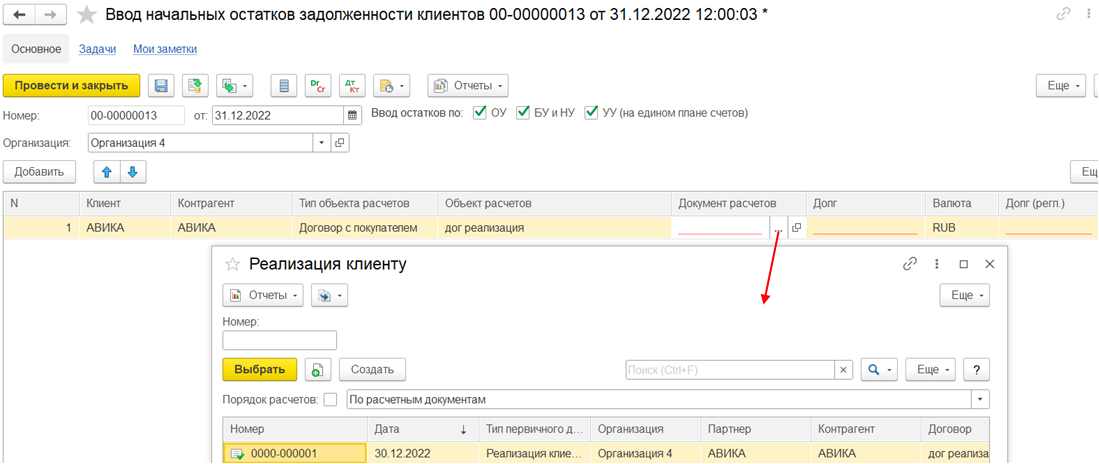 Если в документе ввода начальных остатков задолженности указан клиент/партнер = комиссионер и объект расчетов = договор с клиентом, то возникает долг комиссионера перед комитентом по договору с клиентом. В первичном документе Реализация клиенту на выбор доступен договор с клиентом.
