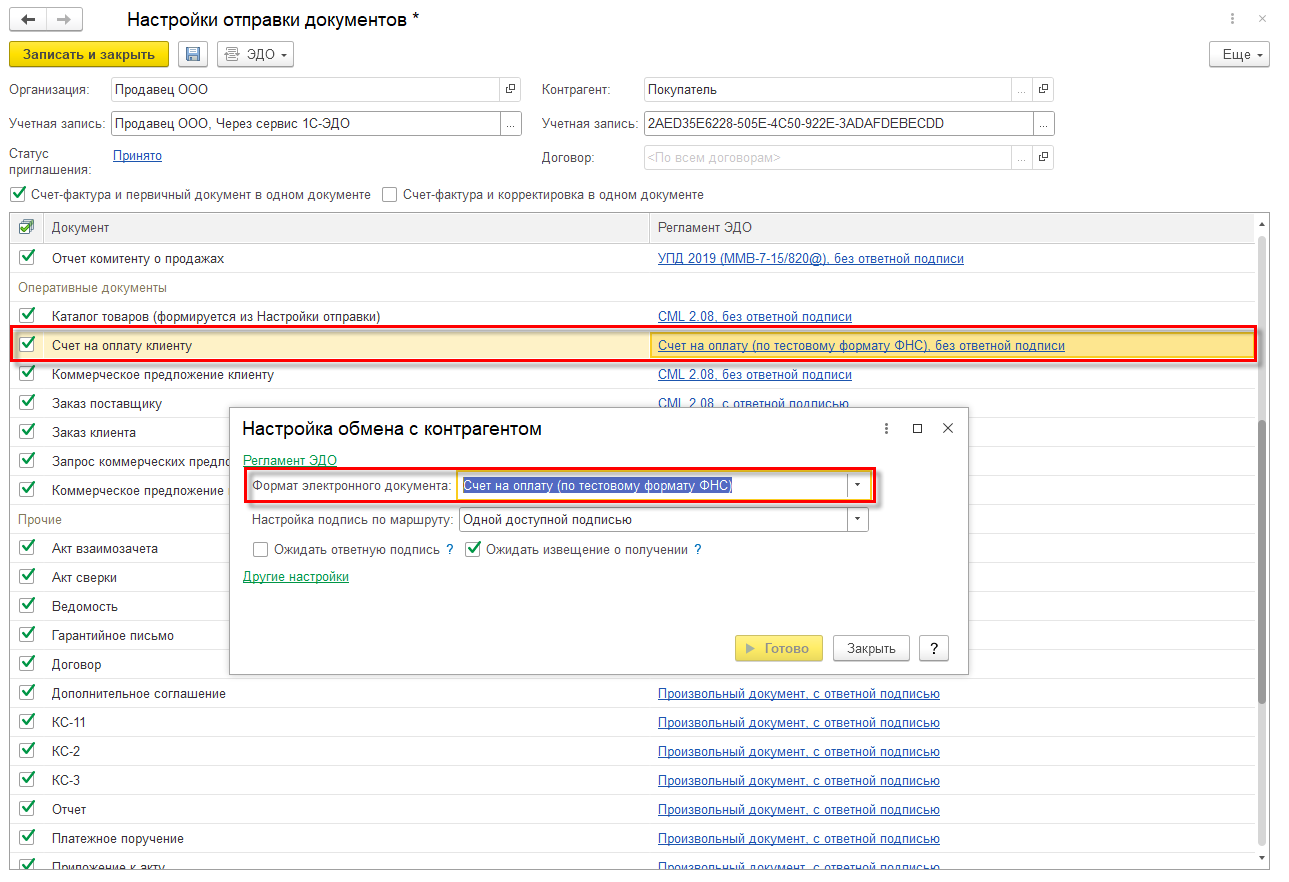 Для обмена электронными документами необходимо выполнить настройки в форме НСИ и администрирование – Настройка интеграции – Обмен электронными документами – Обмен с контрагентами – Настройки ЭДО. На закладке Настройки отправки по каждому контрагенту задается список отправляемых по ЭДО документов с указанием формата и других параметров, предусмотренных регламентом обмена. Такую настройку нужно сделать со стороны организации-продавца, указав в качестве контрагента организацию-покупателя.