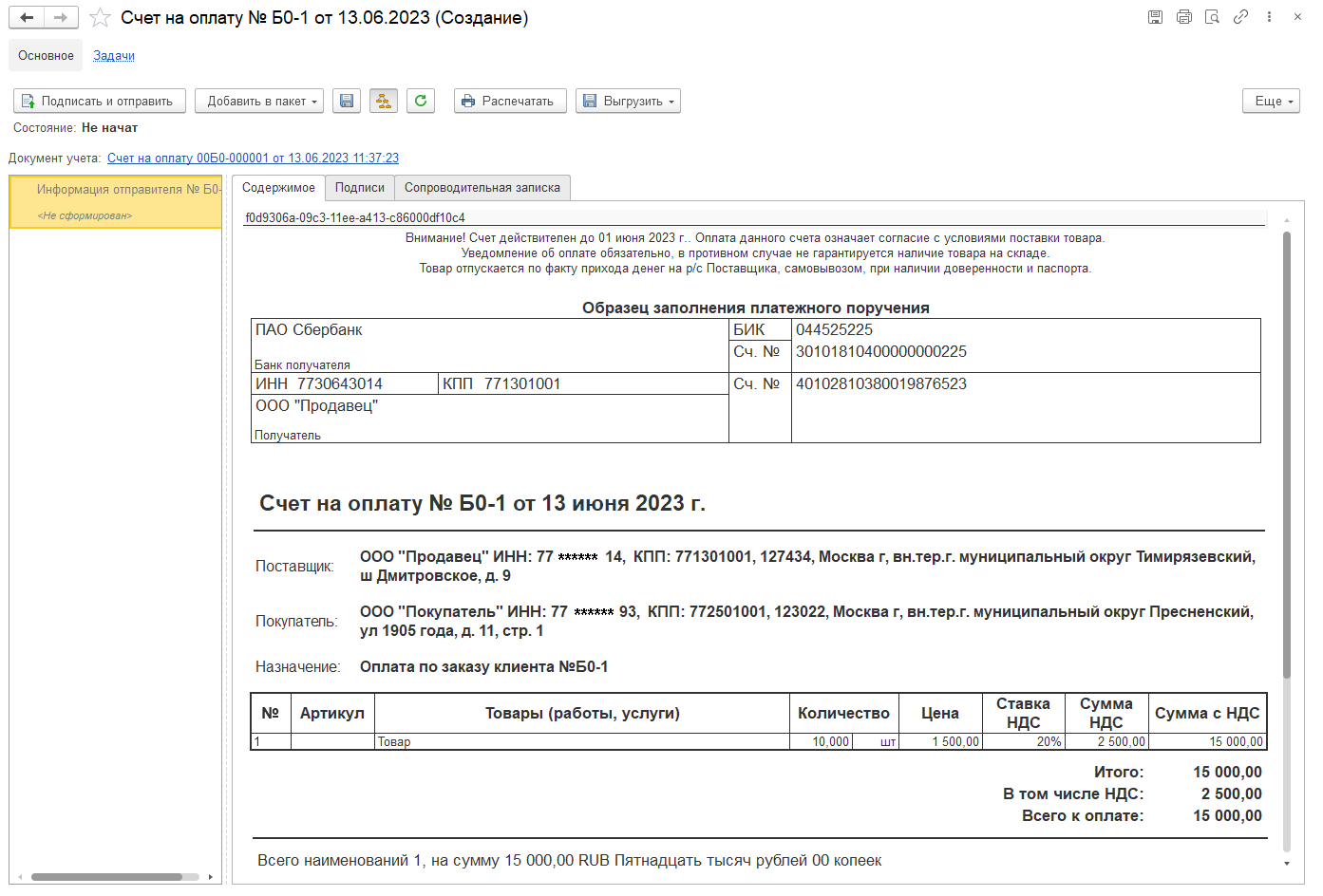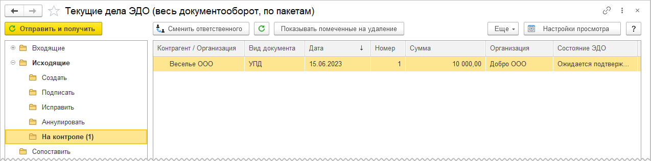 На стороне организации-продавца документ будет загружен при очередном информационном обмен с оператором ЭДО по настроенному расписанию (для клиент-серверного варианта) или при выполнении команды Отправить и получить из списка Главное – ЭДО - Текущие дела ЭДО.