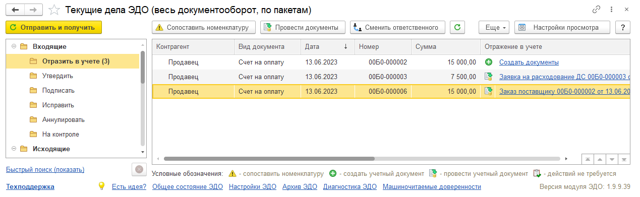 После обработки документа оператором ЭДО он будет загружен по организации-продавцу. Получение новых документов выполняется, в зависимости от настроек, по кнопке Отправить и получить или регламентным заданием на сервере.