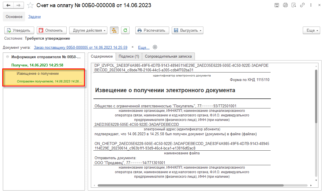 Порядок обмена в общем случае может предполагать подписание и отправку служебного документа Извещение о получении. Извещение формируется автоматически при получении электронного документа организацией-покупателем.