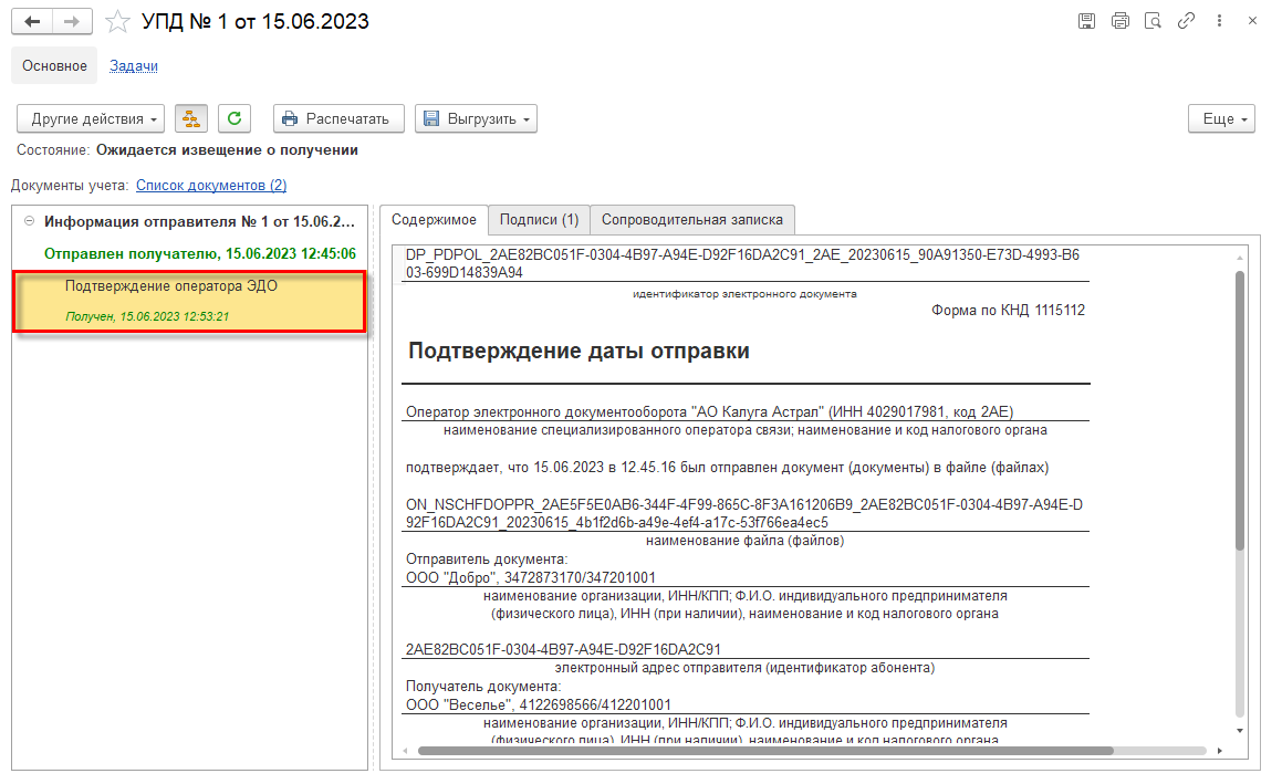 До момента получения от оператора Подтверждение даты отправки по информации покупателя этот УПД будет отображаться в списке Текущие дела ЭДО в папке Входящие \ На контроле. После получения подтверждения электронный документооборот у покупателя будет завершен. Документ перемещается в папку Ознакомится, из которой можно открыть форму просмотра электронного документа.