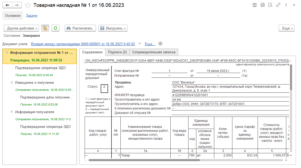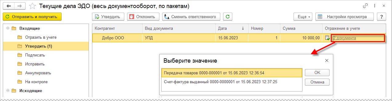 При указанных выше настройках получения документов входящий электронный документ будет автоматически привязан к учетным документам Передача товаров и Счет-фактура, которые будет определены по уникальному идентификатору, присвоенному при формировании электронного документа на стороне отправителя. В графе Отражение в учете сразу появится гиперссылка на эти документы учета (2 документа).