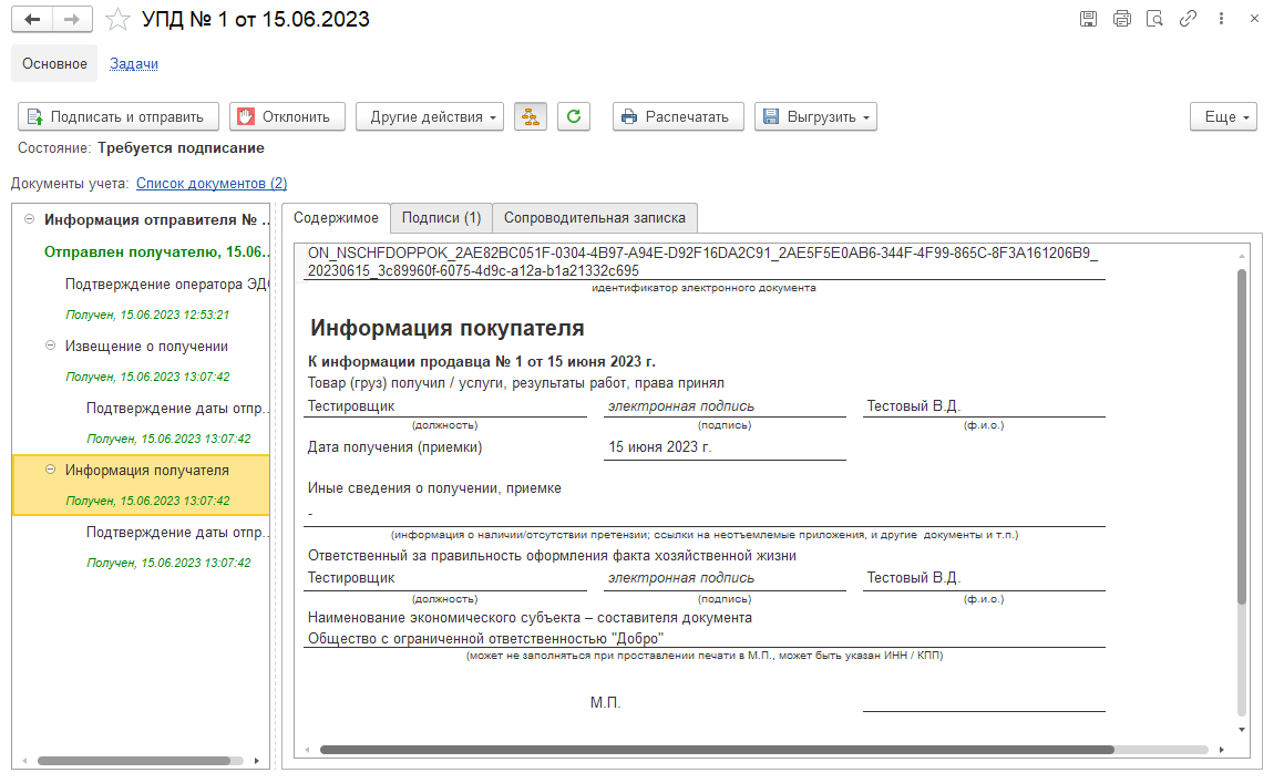 После утверждения формируется раздел УПД «информация получателя». Это можно рассматривать как подписание электронного УПД со стороны покупателя. Просмотреть информацию покупателя можно в форме просмотр электронного документа.