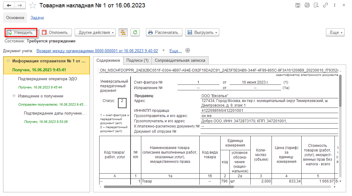 Для завершения сделки, если претензий к показателям УПД нет, покупатель должен утвердить полученный документ. Сделать это можно следующим образом: