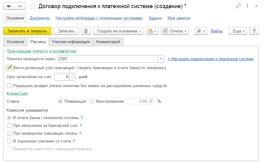 Вариант удержания и указания комиссии банке в документах информационной базы комиссии банка по договору эквайринга указывается в карточке договора подключения к платежной системе на закладке Расчеты (группа настроек Комиссия указывается). Предусмотрены следующие варианты: