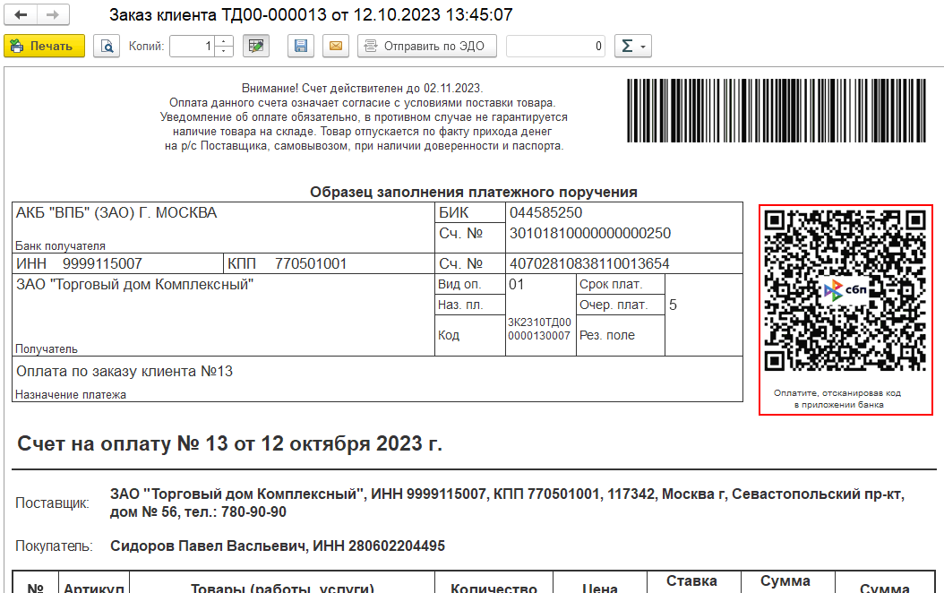 Для возможности проведения оплаты через СБП в печатную форму счета на оплату выводится QR-код СБП.