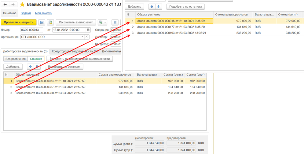 ■ Суммы табличных частей распределяются строго в порядке следования строк в табличных частях взаимозачета задолженности.