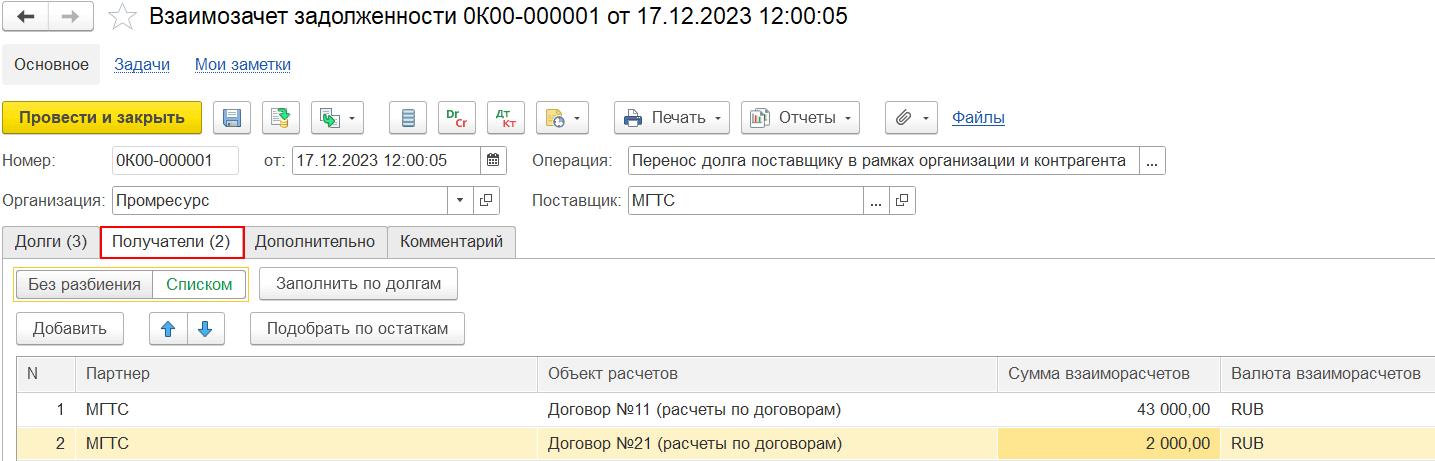 На закладке Получатели указывается несколько объектов расчетов, на которые будет перенесена задолженность с других объектов расчетов.