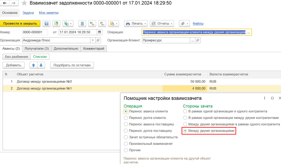 Отражаем перенос авансов с объектов расчетов, договоров между организациями, на объекты расчетов, документы «Передача товаров между организациями», документом Взаимозачет задолженности с операцией Перенос аванса организации-клиента между двумя организациями.