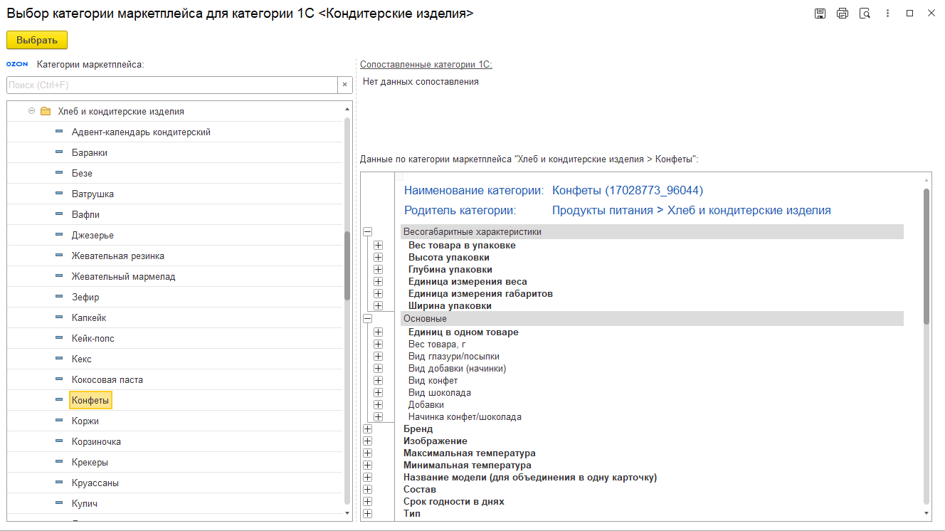 В связи с изменением дерева категорий торговой площадки требуется актуализация сопоставления категорий в 1С и торговой площадки Ozon, а также контроль ранее настроенных правил сопоставления атрибутов, т.к. состав атрибутов при изменении сопоставления (указания типа товара) также может измениться. Для упрощения контроля необходимости актуализации сопоставления категорий в форме настроек обмена с Ozon и в форме сопоставления категорий, атрибутов и их значений добавлено оповещение о наличии устаревших категорий.