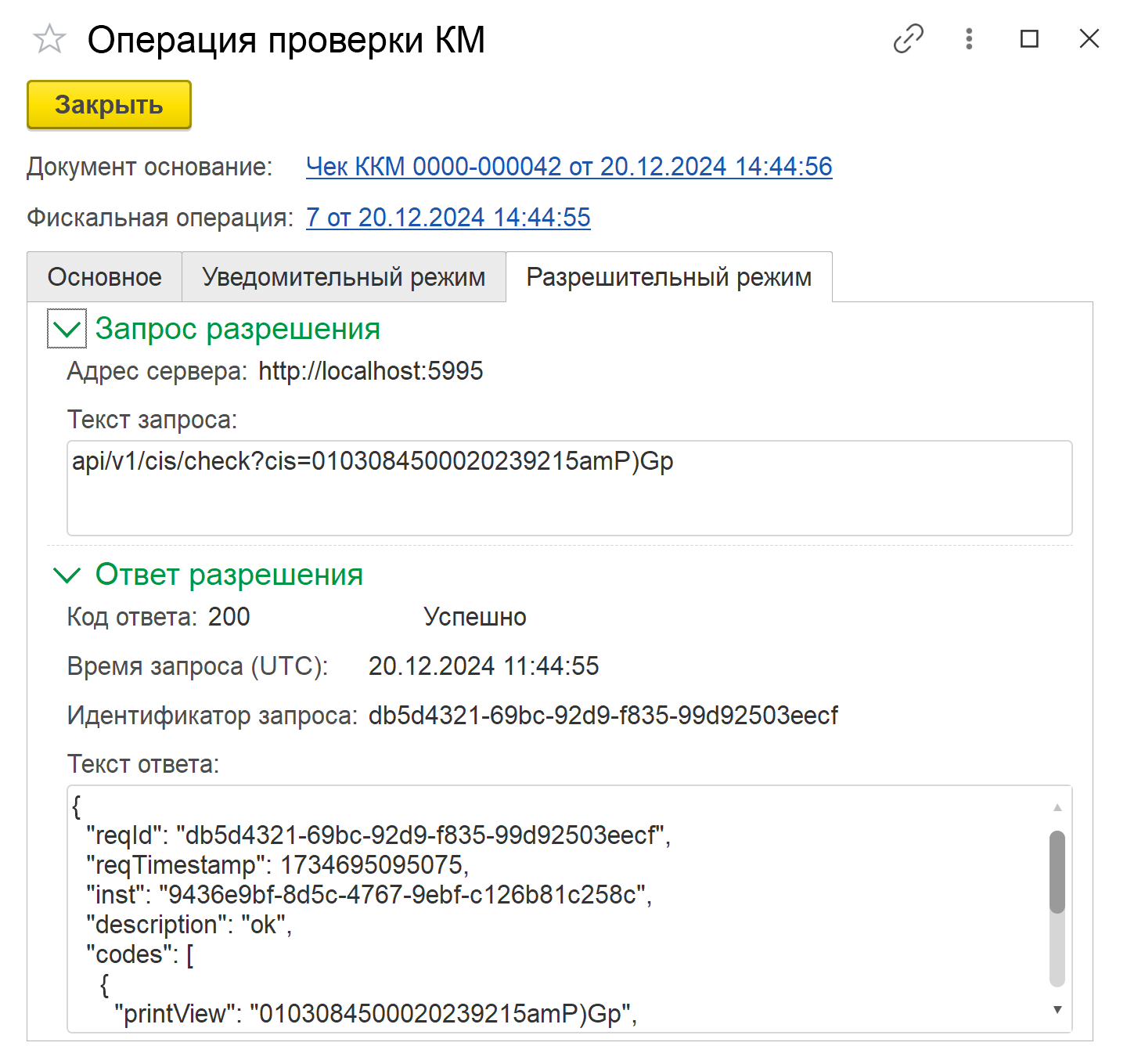 На закладке Разрешительный режим можно посмотреть текст запроса и тест ответа разрешения. В случае возникновения таймаута онлайн разрешительного режима будет отправлен запрос на установленные Локальные модули «Честный знак» и сохранен результат запроса с указанием локального модуля.