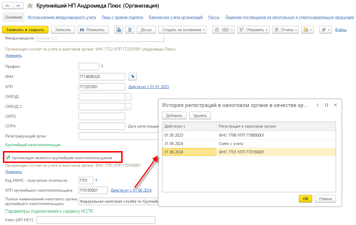 Если ранее была указана регистрация в качестве крупнейшего налогоплательщика в качестве основной, после обновления в карточки Организации заполняются новые реквизиты КПП крупнейшего налогоплательщика, и КПП по основной регистрации. Проверьте корректность заполнения реквизитов.