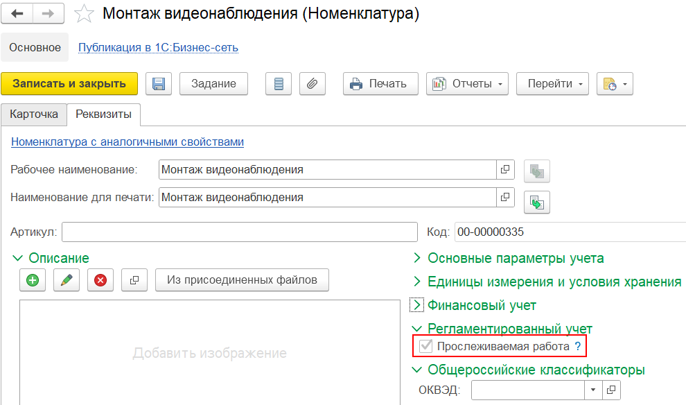 В карточке прослеживаемой номенклатуры типа «Работа» необходимо установить флаг «Прослеживаемая работа». При установленном флаге работа будет учитываться как прослеживаемая и можно получать и передавать прослеживаемые товары в составе этой работы.