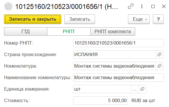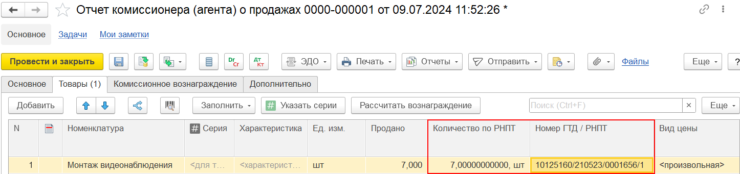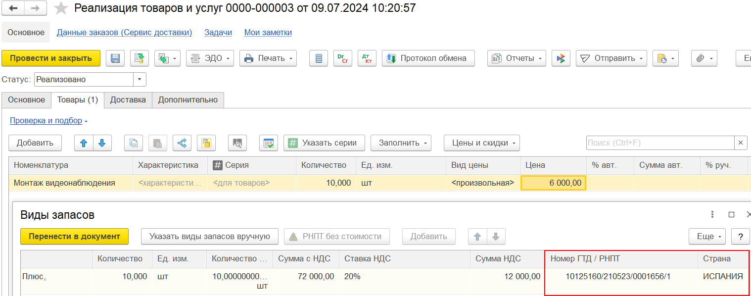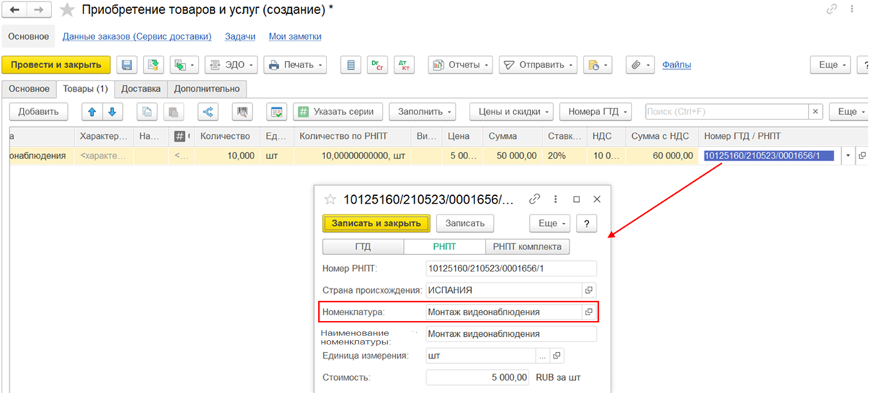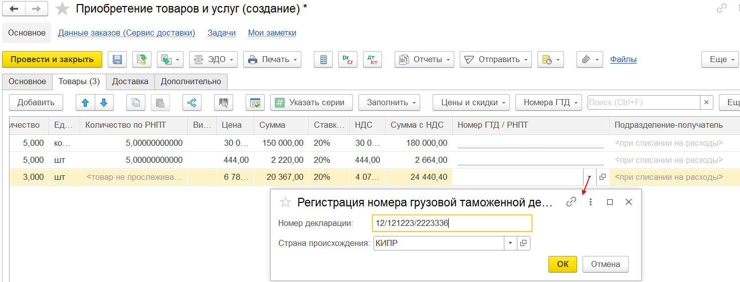 Создание и указание номера ГТД/РНПТ для импортных товаров