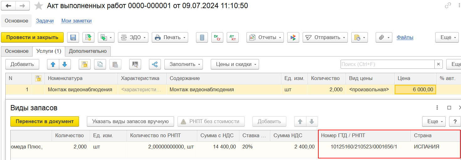 Для прослеживаемых работ, как и для товаров, заполняется табличная часть «Виды запасов» (доступна по команде «Еще – Открыть виды запасов» на форме накладной).
