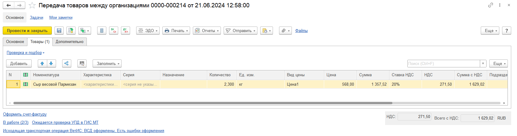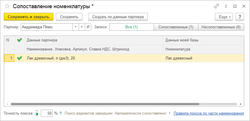В процессе загрузки может возникнуть необходимость в сопоставлении номенклатуры контрагента с нашей номенклатурой. Процесс абсолютно аналогичный другим сервисам ЭДО. Нужно выполнить сопоставление и нажать Сохранить и закрыть, процесс создания документа будет продолжен, а после завершения откроется форма созданного документа.