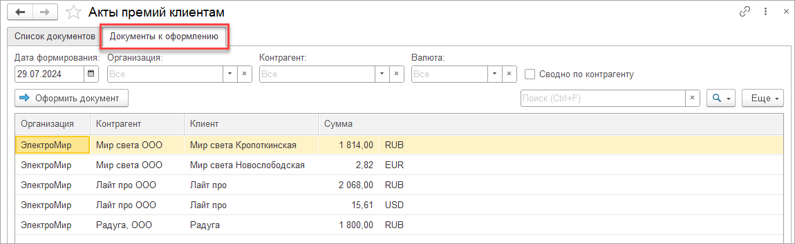Документы пользователь формирует интерактивно.
