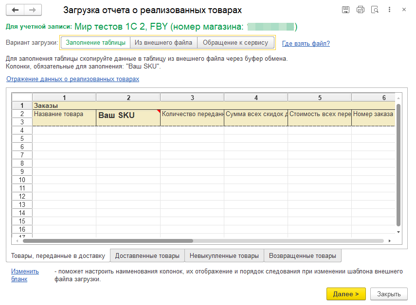 Если после заполнения таблицы или загрузки файла данными торговой площадки не удастся автоматически их сопоставить с данными учетной системы, или если не заполнены обязательные реквизиты, то отображается таблица для дозаполнения обязательных значений.