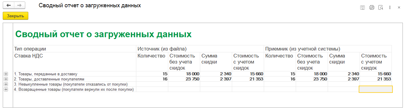 Предусмотрена возможность вывода сводной информации о результатах загрузки в виде отчета (команда Отчет о загрузки данных): сравнение показателей учетной системы и файла Яндекс Маркет.