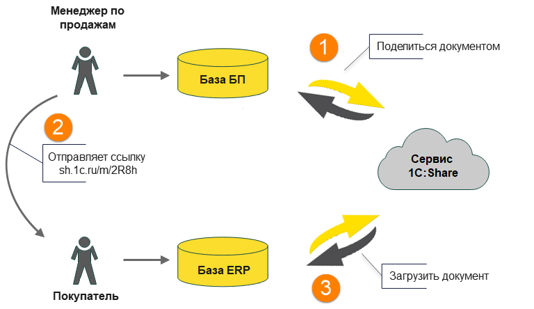 Сервис 1C:Share предназначен для одностороннего обмена электронными документами в CML формате без ЭЦП. Для начала работы с сервисом не требуется специализированных настроек, регистрации отправителя и получателя в каких-либо сервисах, и приглашений контрагентов. Доступна возможность поделиться документом с выбором присоединенных файлов через электронную почту, мессенджеры и просмотреть, скачать электронный документ на веб-странице.