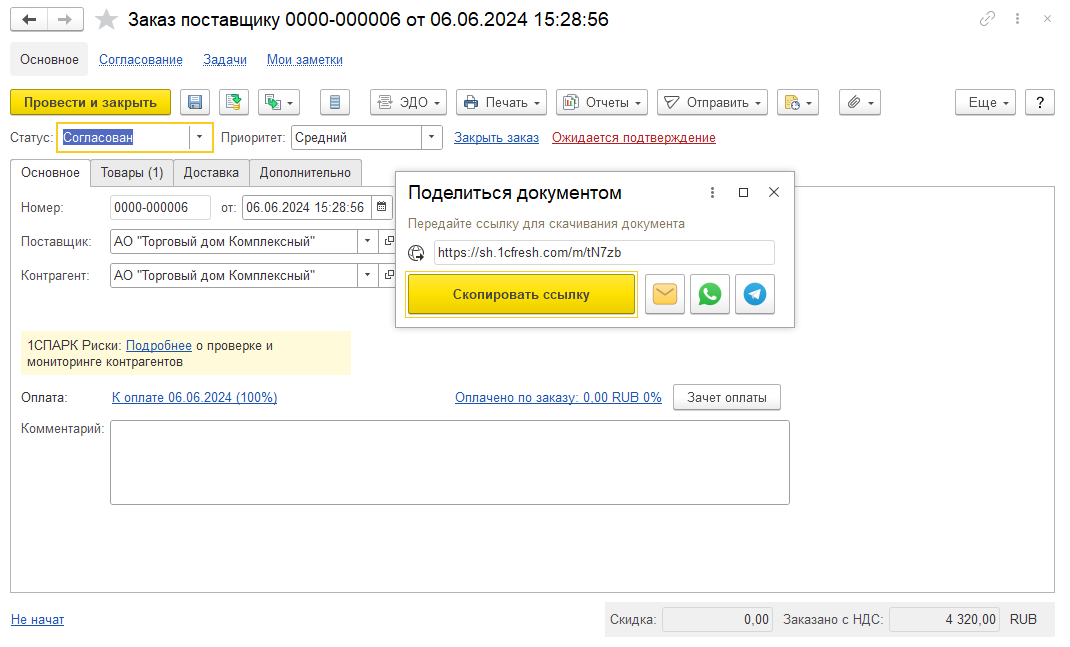 После выполнения команды Поделиться документом открывается форма с короткой ссылкой на выгруженный в сервис документ. Ее можно отправить получателю непосредственно из формы по электронной почте, WhatsApp, Telegram или скопировать в буфер и отправить иным способом.