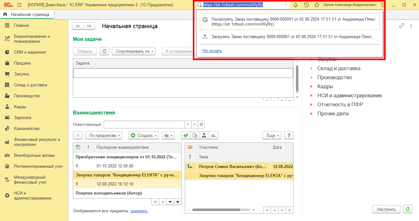 При выборе команды Загрузить документ по ссылке в разделах командного интерфейса Закупки или Продажи открывается форма, в которую нужно вставить ссылку и выполнить команду Найти.