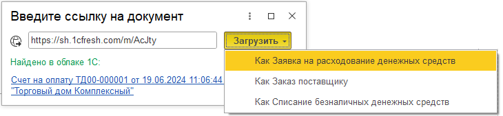 Если для загружаемого электронного документа есть несколько возможных типов документов, которые могут быть созданы на его основании (актуально для входящих счетов на оплату), то отображаются три команды Загрузить как и далее тип создаваемого документа.