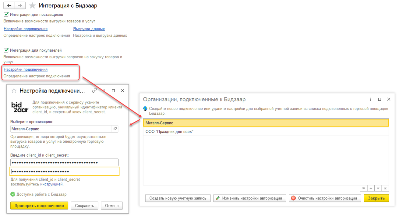 После включения функциональности необходимо также выполнить настройку подключения к Бидзаар по организациям. Это действие может выполнить Администратор или Руководитель отдела закупок (или менеджер по закупкам). Для подключения указывается пара ключей, которые необходимо получить у поддержки Бидзаар по инструкции