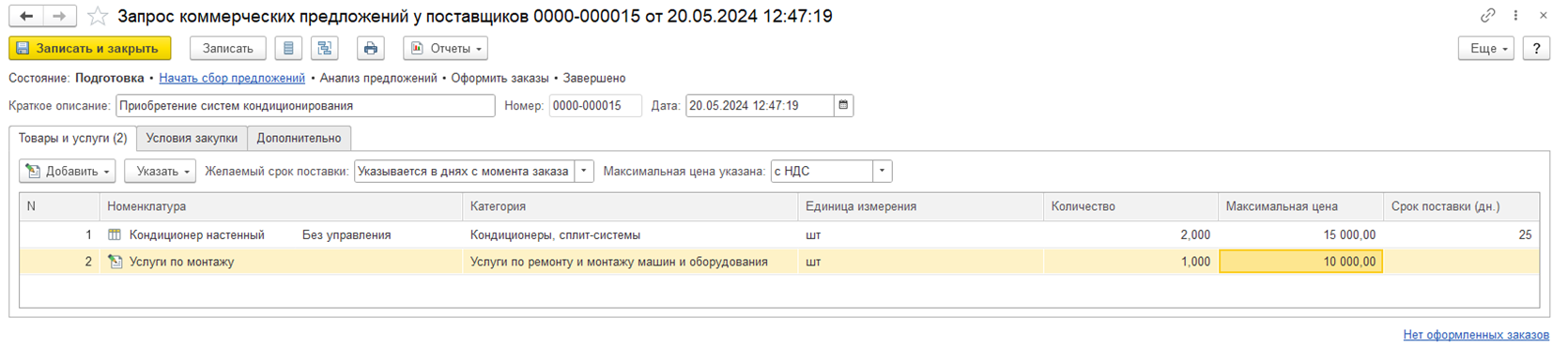 Для публикации запроса коммерческих предложений необходимо создать документ Запросы коммерческих предложений у поставщиков со способом размещения Публикация в Бидзаар (указывается на закладке Условия закупки), в котором указываются товары (услуги) для закупки и адрес поставки.