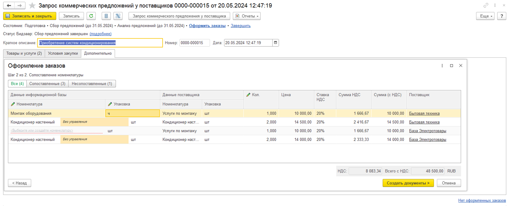 При загрузке итогов открывается форма, в которой требуется сопоставить контрагентов Бидзаар (победителей закупки) и партнеров (контрагентов) в информационной базе 1С, сопоставить номенклатуру по данным поставщика и информационной базы, а также подтвердить закрытие документа Запросы коммерческих предложений у поставщиков.