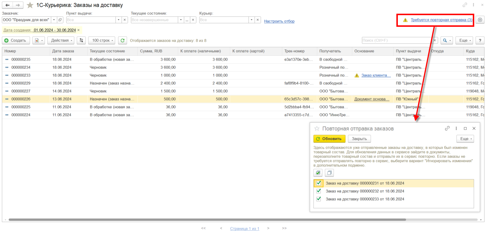 В случае изменения уже отправленного заказа потребуется его повторная отправка. В списке заказов 1С-Курьерика присутствует уведомление о появлении в системе измененных заказов, а также доступна гиперссылка, по которой открывается форма повторной отправки документов в сервис.