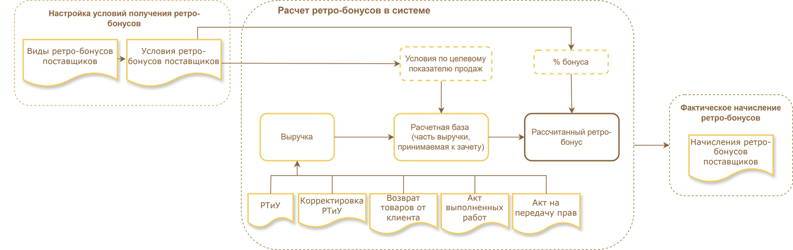 ■ Ретро-бонусы рассчитываются в системе. Принцип проверки условий и расчёта ретро-бонуса от поставщика определяется типом бонуса и целевым показателем.