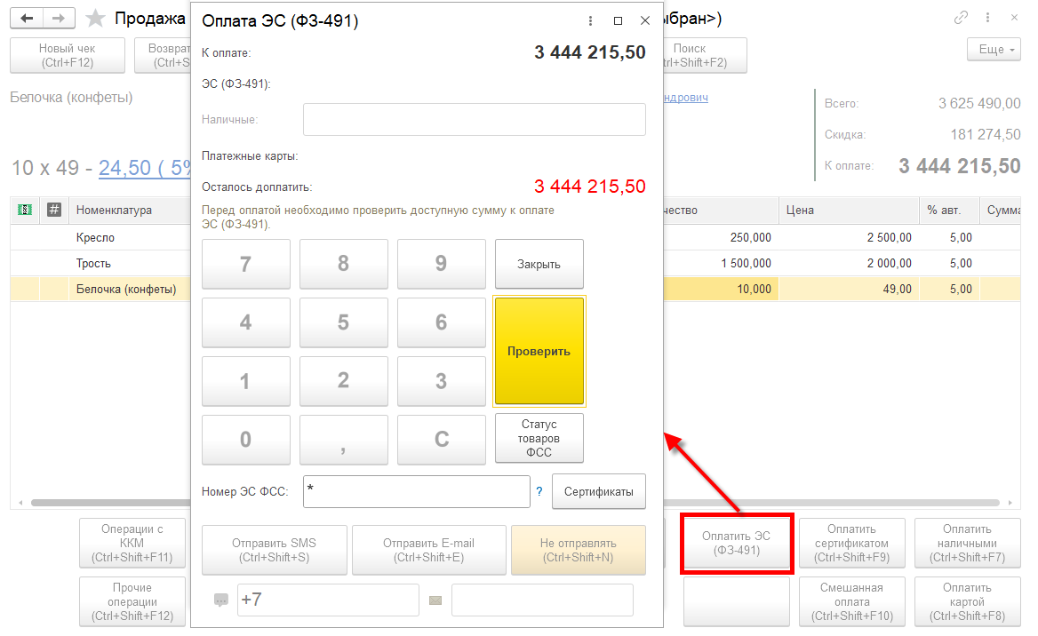 Если сумма к оплате больше, чем доступная сумма оплаты сертификатом, то остаток покупатель может доплатить наличными (соответствующая сумма должна быть указана в графе Наличные форме Оплата ЭС (ФЗ-491)) или остаток будет списан с карты МИР, предъявленной покупателем. После проверки сертификата в форме Оплата ЭС (ФЗ-491) доступна команда Оплатить, по которой можно принять оплату и пробить чек.