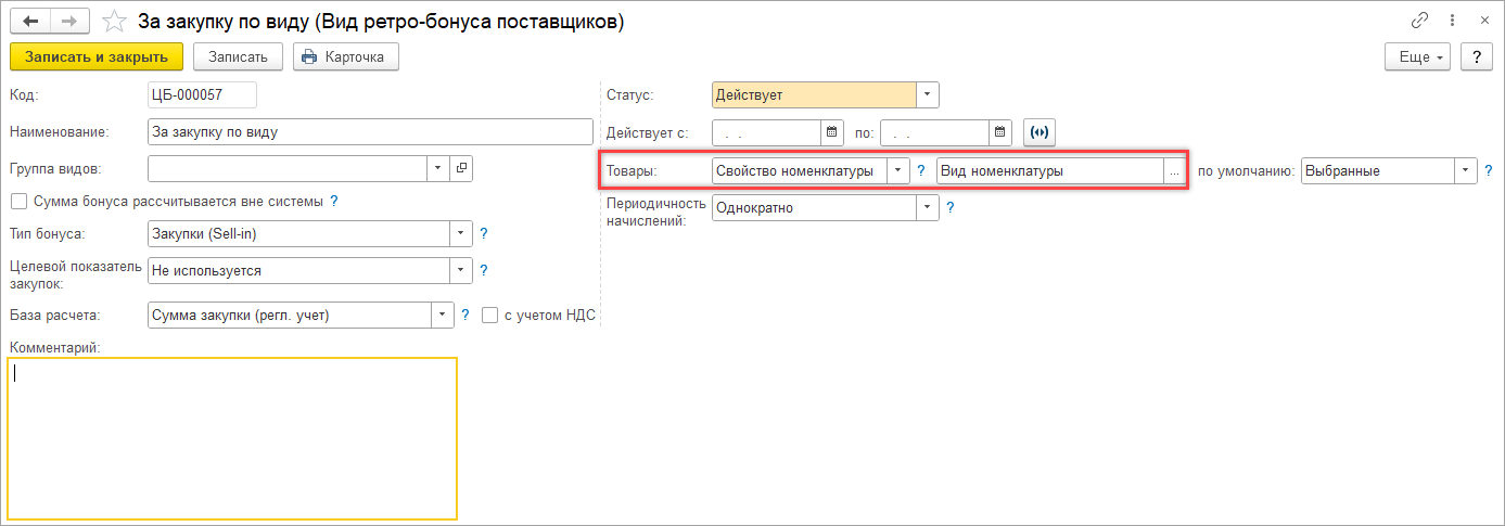 Доступен из документов Условия ретро-бонусов поставщика, в которых товары указаны через сегменты или свойства номенклатуры.