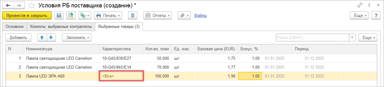 Добавлена возможность настройки условий бонусов по номенклатуре без детализации по характеристикам: тогда расчет бонусов будет осуществляться за закупку клиентами любых характеристик указанного товара.