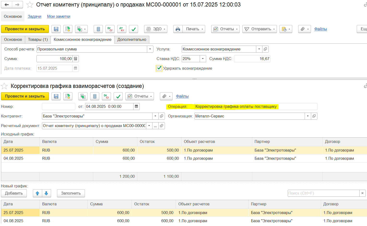 Доступность списка операций зависит от наличия у исходного документа движений расчетов. Если доступен только один тип операция, то в корректировке поле Операция блокируется, например, при выборе документа реализации товаров и услуг. Несколько значений операций доступно, например, при выборе в корректировке документа отчет комитенту (принципалу) о продажах, поскольку документ формирует как движения по расчетам с поставщиками, так и движения по расчетам с клиентами. В таком случае в корректировке вручную выбирается необходимая операция – корректировка графика оплаты клиентом (для корректировки графика оплат комиссионного вознаграждения комиссионеру), либо корректировка графика оплаты поставщику (для корректировки графика оплаты долга комиссионера поставщику/комитенту). Аналогичное поведение и для отчета комиссионера о продажах.
