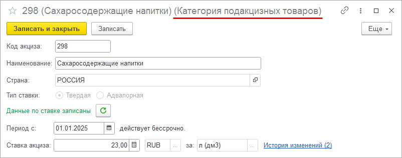 Определение параметров начисления акцизов выполняется с использованием элементов нового списка Категории подакцизных товаров (меню НСИ и администрирование – НСИ – Классификаторы номенклатуры). В карточке элемента списка Категории подакцизных товаров настраивается: