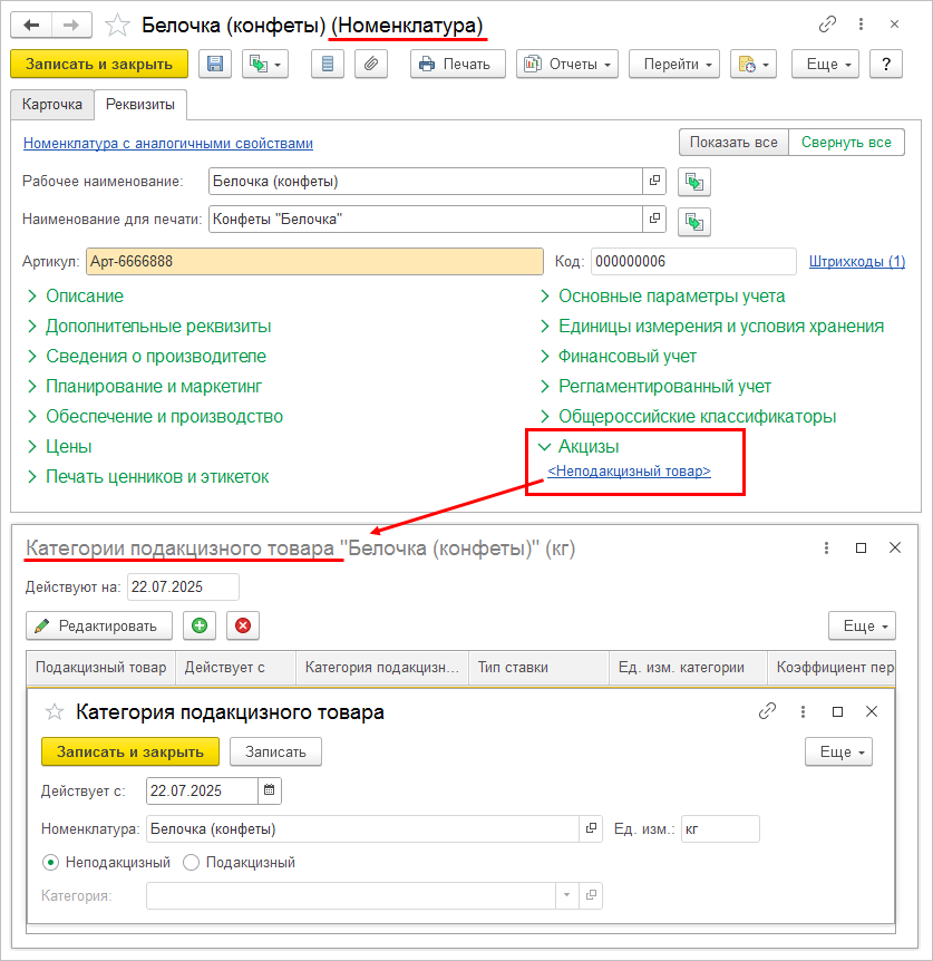 Информация о подакцизности/неподакцизности товара и настроенности категорий доступна по гиперссылке в группе настроек Акцизы в карточке элемента списка Номенклатура. Если для номенклатуры указана категория подакцизных товаров, тогда дополнительно доступна гиперссылка История категорий, по которой выполняется переход ко всем записям по изменению категорий подакцизности номенклатуры.