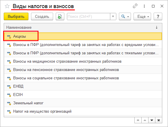 В список Виды налогов и взносов добавлен предопределенный элемент Акцизы.