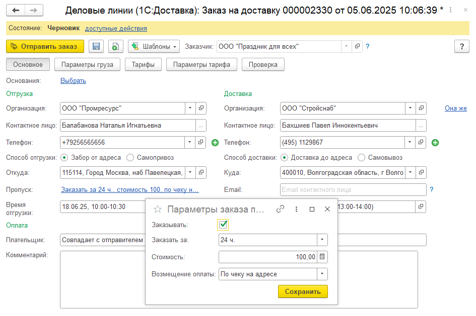 На закладке основное предусмотрена возможность указать параметры пропуска при заборе груза по адресу отправителя. Возможно указать следующие параметры пропуска: