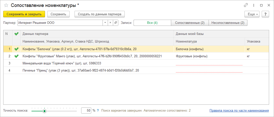 После подбора соответствия необходимо проверить данные и выполнить запись карточек в информационную базу по команде Сохранить или Сохранить и закрыть.