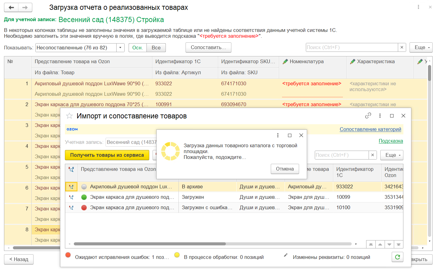 Импорт каталога оптимизирован за счет получения всего товарного каталога (кроме архивных позиций) с торговой площадки и его записи в ИБ в фоновом режиме для дальнейшего сопоставления загруженных данных пользователем.