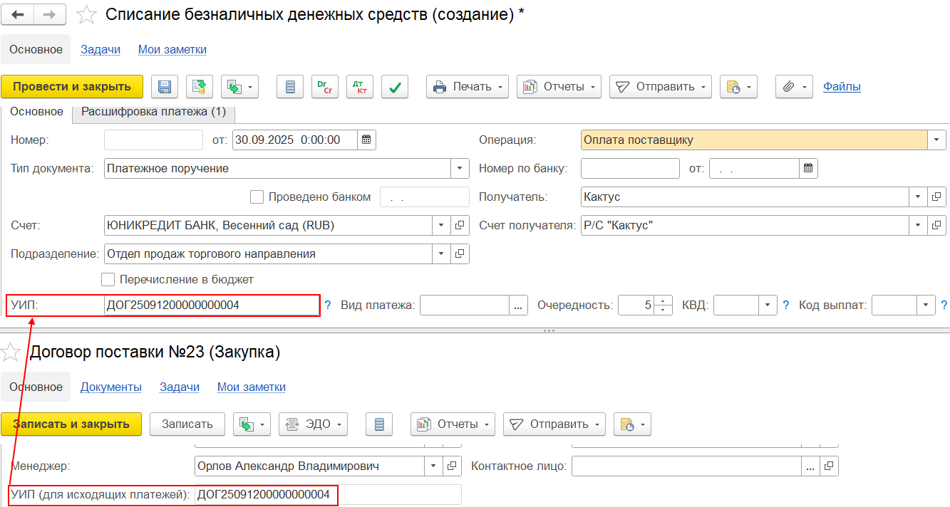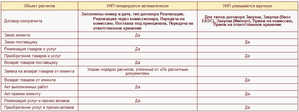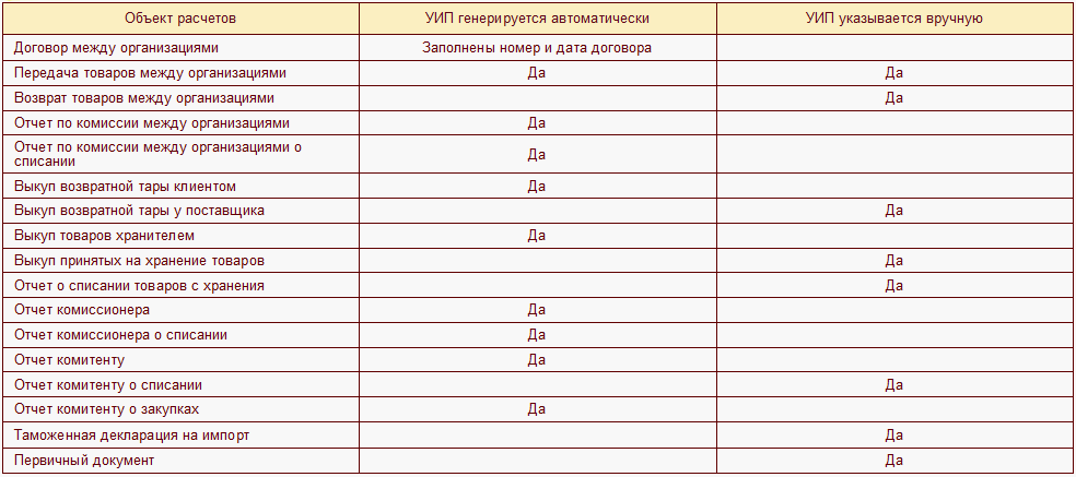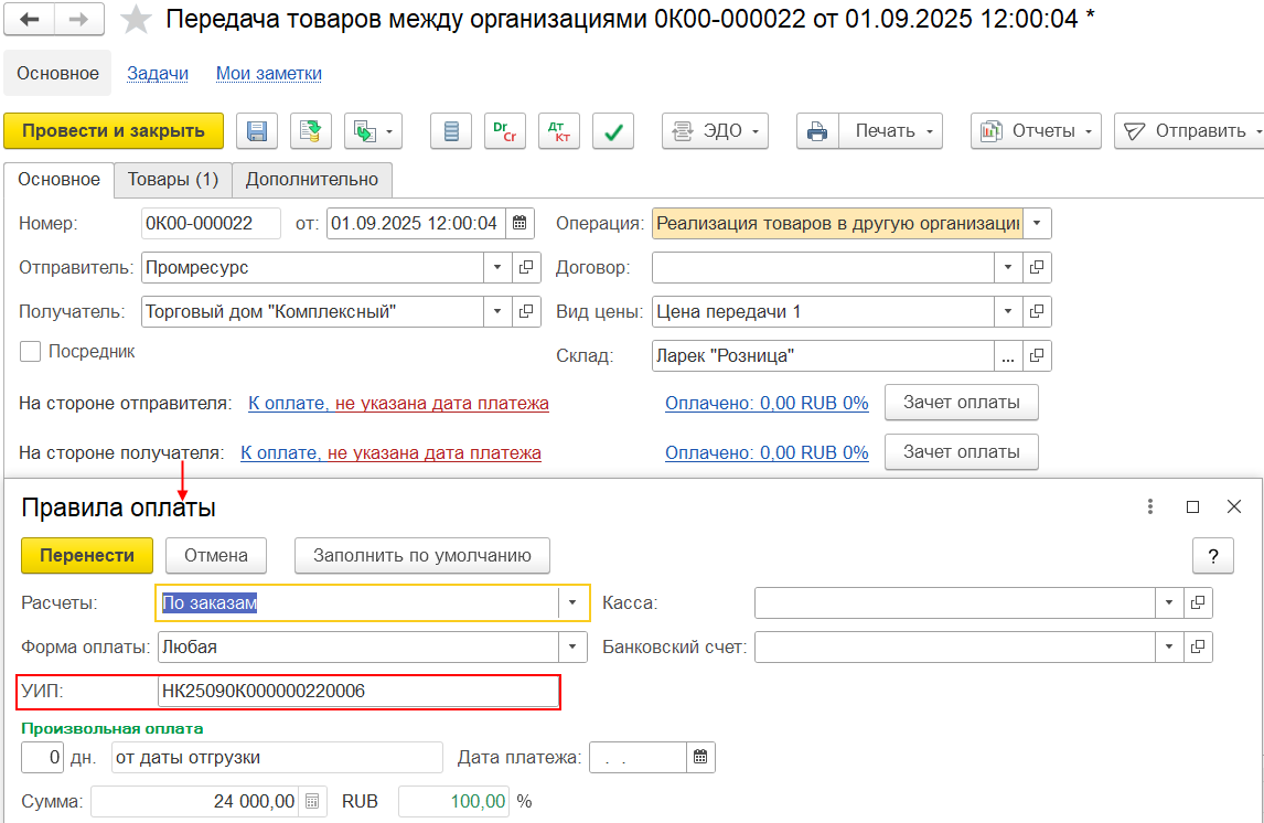 При передаче товаров между организациями УИП заполняется автоматически, а также может быть скорректирован вручную в правилах оплаты на стороне получателя.