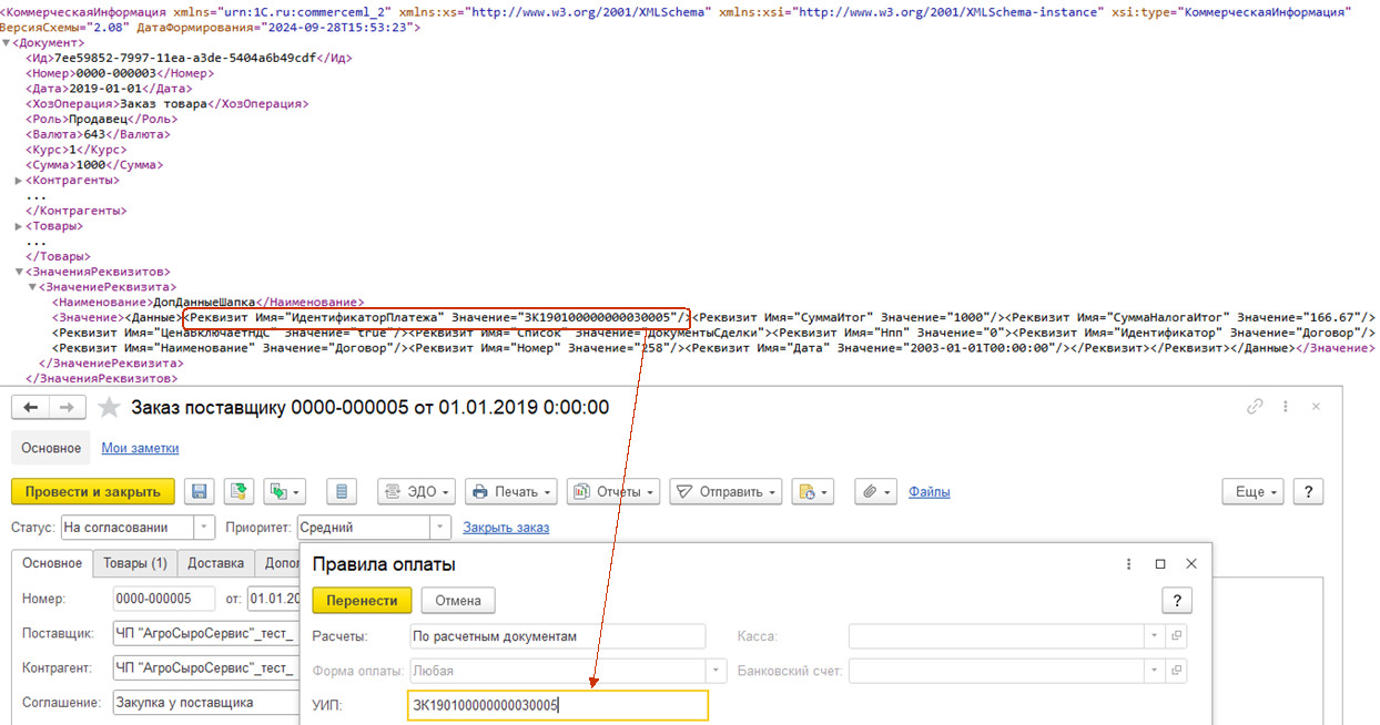 Если в составе данных электронного документа с типом «Ответ на заказ» передан идентификатор платежа, его значение заполняется в поле УИП при создании по данным ЭД заказа поставщику.
