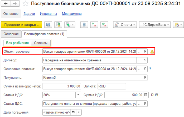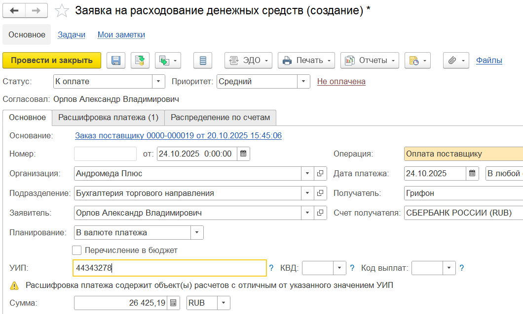 Если списание безналичных ДС оформлено по заявке на расходование ДС, то УИП заполняется в списании из заявки. Предупреждения о наличии различий УИП при оплате по заявке не отображаются.