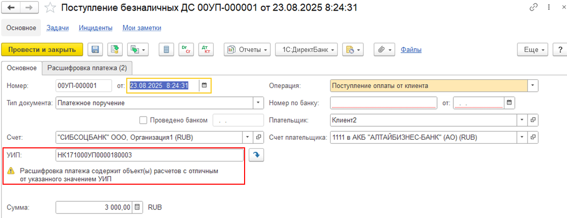 расшифровки платежа указан объект расчетов с заполненным УИП, значение которого