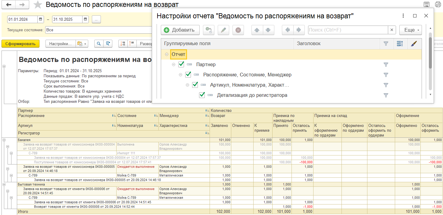 Отчет отображает сводную информацию по распоряжениям за период с детализацией до номенклатуры – сколько товаров было заявлено на возврат, принято, оформлено.