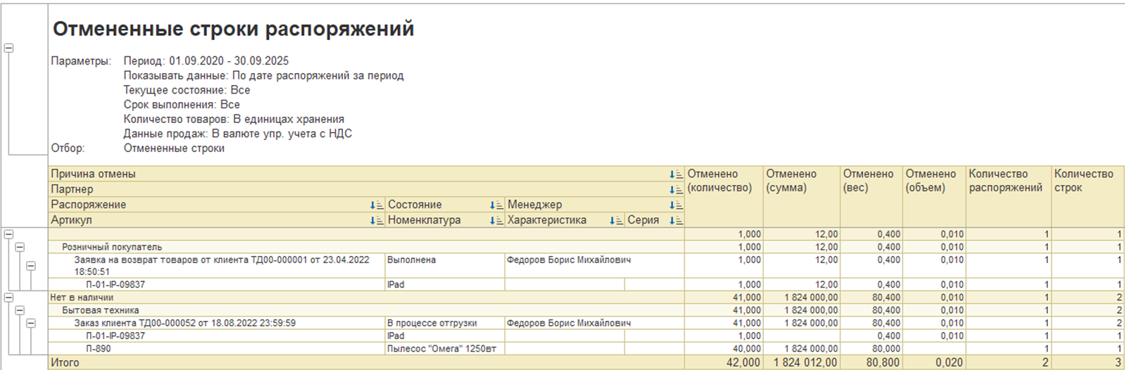 Отчет отображает отмененные строки распоряжений за период и позволяет получить информацию о том, сколько заказов, каким клиентам отменили, какие товары отменили и в каком количестве и по какой причине.