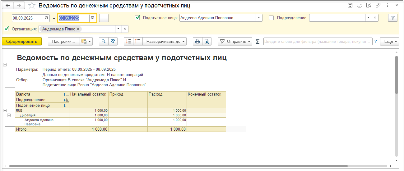Сформируем отчеты после ввода документа корректировки расчетов с подотчетными лицами.